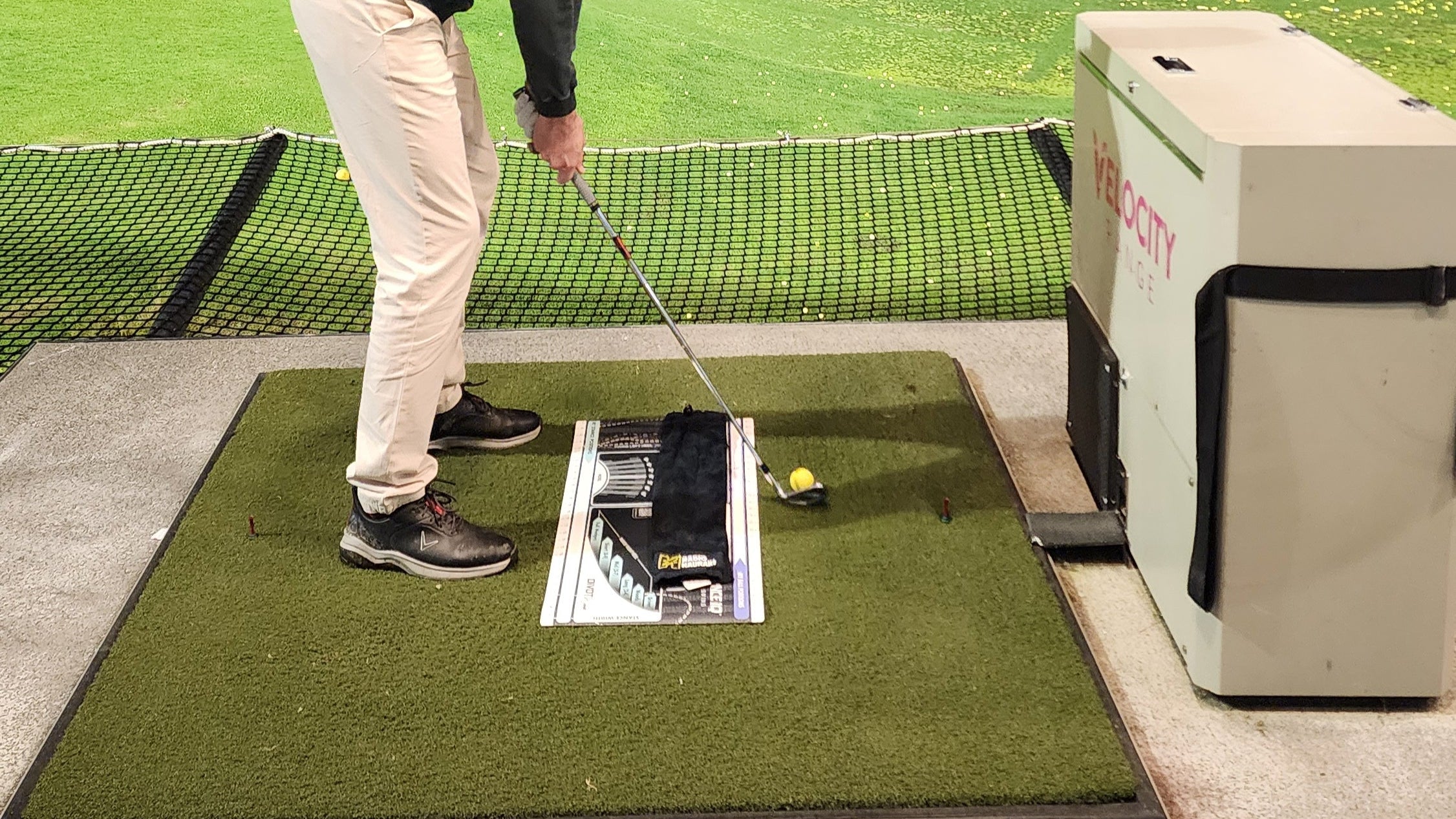 - Choose the club you want to work on (we'd suggest starting with a mid iron) and setup to hit from your preferred ball position and stance width for that club.
